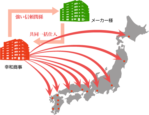 より高品質の商品を、確実にお届けする事。それが商社に課せられた使命ではないでしょうか?幸和商事は、長年培ってきたメーカー様との信頼関係と、販売会社様との絆をもとに、他にはない独自の流通網で商品をデリバリーしています。「真の商品価値とは何か?」幸和商事は、現状に満足する事なく、ベストマッチなデリバリー サービスを追求していきます。